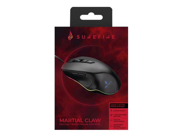 La souris Martial Claw de SureFire offre précision, vitesse et personnalisation avec une résolution allant jusqu'à 7 200 PPP, 7 boutons programmables et un éclairage RGB multi-options.
