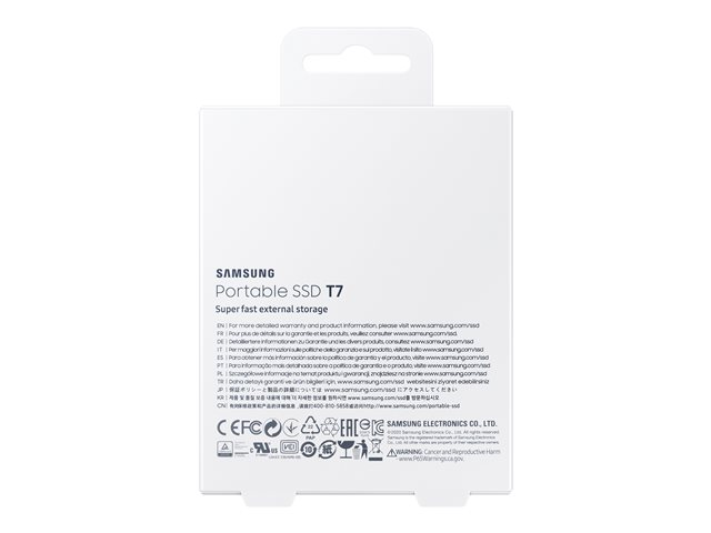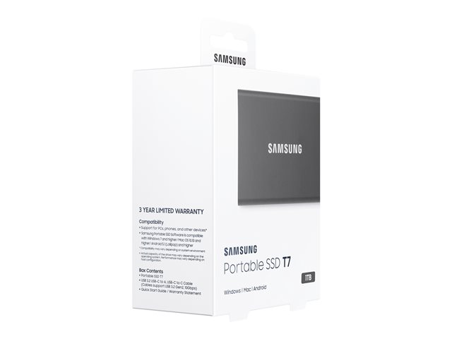 Description du produit Samsung T7 MU-PC1T0T - SSD - 1 To - USB 3.2 Gen 2 Type Lecteur à semi-conducteurs - externe (portable) Capacité 1 To Cryptage matériel Oui Algorithme de chiffrement AES 256 bits Interface USB 3.2 Gen 2 - USB-C Débit de transfert de données 10,0 Gbps (USB 3.2 de 2e génération) Caractéristiques Antichoc, authentification du mot de passe, Dynamic Thermal Guard protection, NVM Express (NVMe), AES 256 bits Source d'alimentation Bus USB Couleur du boîtier Gris titan Dimensions (LxPxH) 85 mm x 8 mm x 57 mm Poids 58 g Garantie du fabricant Garantie de 3 ans -