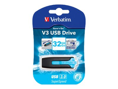 Description du produit Verbatim Store 'n' Go V3 - clé USB - 32 Go Type du Produit Clé USB Type d'Interface USB 3.0 Capacité de stockage 32 Go Couleur du boîtier Bleu des Caraïbes Système d'exploitation requis Apple MacOS X 10.4 ou plus récent, Microsoft Windows Vista / XP / 7, Linux 2.4.0 ou ultérieur Garantie du fabricant Garantie limitée à vie -