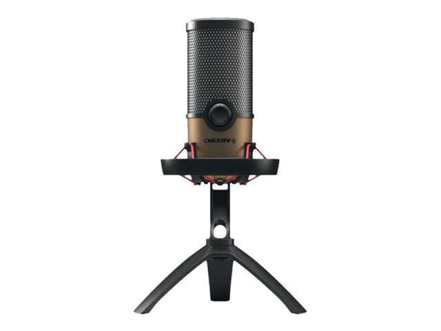 Le CHERRY UM 9.0 PRO RGB séduit par sa conception. Avec son trépied entièrement métallique qui lui assure une bonne stabilité et ses couleurs noir mat et cuivre, ce microphone USB profession-nel attire tous les regards.