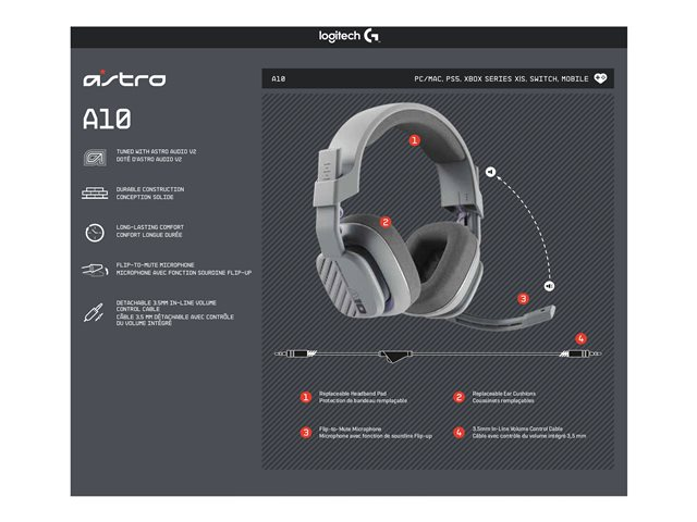 Améliorez votre configuration de gaming habituelle avec le casque ASTRO A10 2ème génération pour PC. Un son explosif grâce aux transducteurs dynamiques de 32 mm, un micro à tige avec fonction de sourdine Flip-up et une conception durable avec des coussinets et une protection de bandeau amovibles pour une expérience audio inoubliable. Plus besoin de s'inquiéter des coussinets ou d'acheter un autre casque dès les premiers signes d'usure. Préparez-vous à des sessions de gaming jusqu'au bout de la nuit grâce à l'egonomie de l'A10 2ème génération son design en charge close, sa construction ultra-durable et son arceau confortable : il durera bien plus longtemps que votre bon vieux casque! Réglez le son sans quitter votre siège, grâce au réglage du volume intégré, ainsi, vous ne manquerez jamais une seconde d'action.