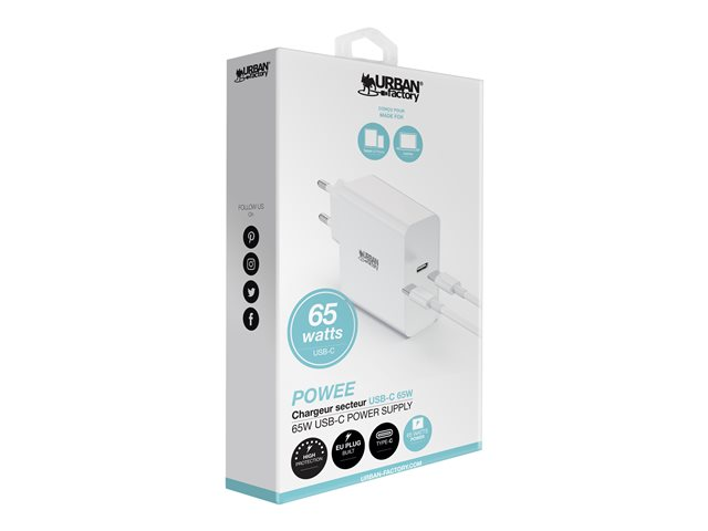 POWEE est une alimentation universelle d'une puissance de 65 W qui permet de recharger tous les modèles d'ordinateur portable alimentés en USB-C et nécessitant au maximum 65 W. L'alimentation est livrée avec un câble de connexion USB-C vers USB-C. Elle est compatible avec les constructeurs ayant optés pour une alimentation de leur ordinateur en USB-C.