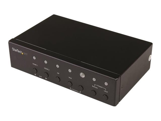 Cet extendeur HDBaseT intègre un commutateur convertisseur. Vous pouvez ainsi connecter deux sources HDMI ainsi qu'une source vidéo VGA et DisplayPort au même écran HDMI à distance sans recourir à des adaptateurs ou scalers supplémentaires ou à un commutateur vidéo séparé.