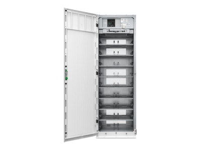 Battery cabinet that includes Lithium-ion batteries, Battery Management System (BMS), switchgear, power supply, and communication interface.